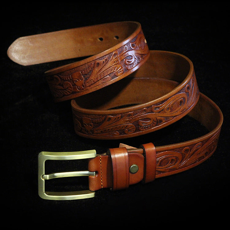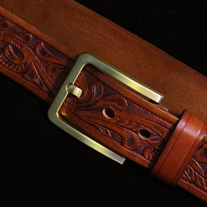 Men's Vintage Tang Turf Carved Top Layer Yellow Leather Belt