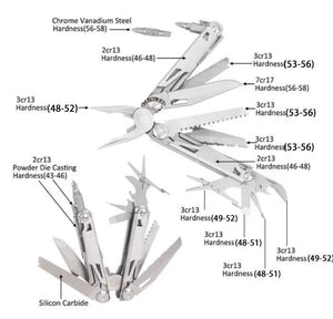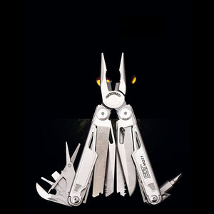 Functions: needle-nosed pliers, pipe clamp, thread cutting pliers, thread cutting holes, thread stripper, can opener, glasses screwdriver, flat screwdriver, scissors, serrated knife, wood saw, knife, double-sided file,